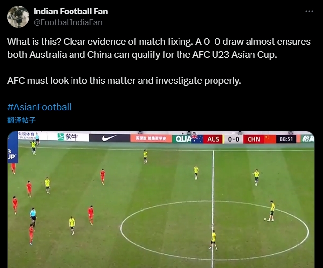 一位印度足球博主在社交媒体上质疑比赛存在默契球行为。他发布了一段澳大利亚队在比赛尾声阶段于后场频繁倒脚并颠球的视频,配文称:“这算什么?明显是假球的证明。一场0比0的平局让中澳两队双双晋级U23亚洲杯。亚足联必须介入,对此事展开严肃调查。”