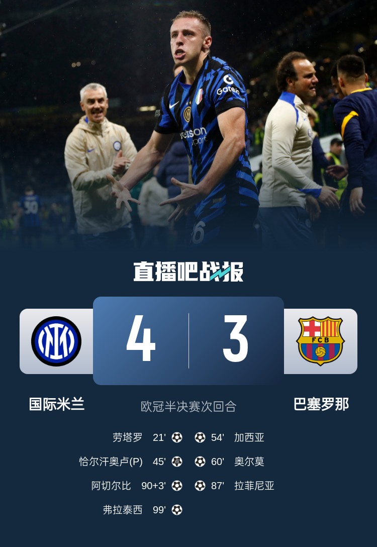 体育资讯5月7日讯 据国米新闻网报道称,多项数据显示,国米4-3巴萨的比赛在周二取得了惊人的收视成绩,在电视和网络上都引起了巨大关注,观众人数非常惊人。