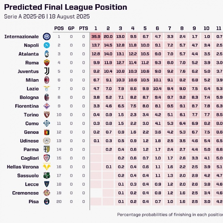 8月21日体育讯 知名数据机构opta运用超级计算系统对本赛季意甲冠军归属进行模拟测算,结果显示国际米兰以35.9%的夺冠概率高居榜首,那不勒斯与亚特兰大分别以13.7%和12.8%的概率位列第二、三位。